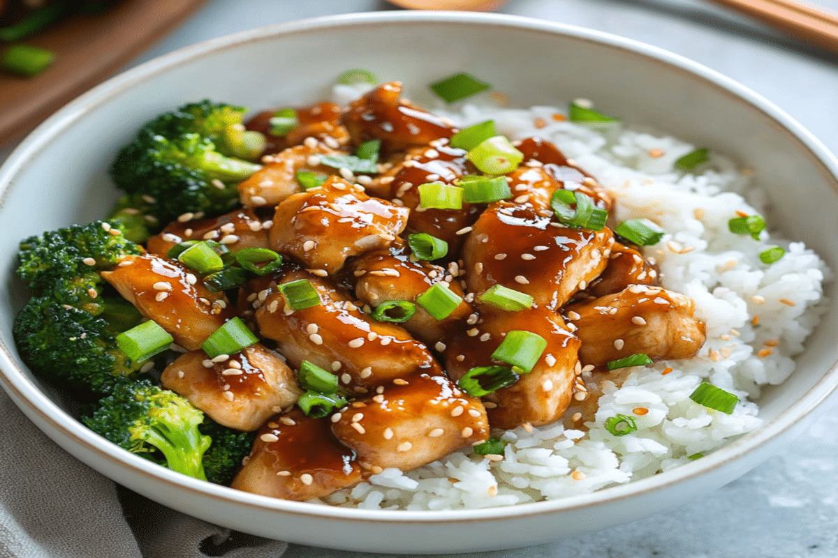 Un pui teriyaki bine făcut merită servit simplu, dar cu atenție la detalii. Imediat după gătire, transferă-l într-un bol sau pe o farfurie întinsă și presară semințe de susan și ceapă verde tocată. Acestea adaugă prospețime și un contrast plăcut de texturi.