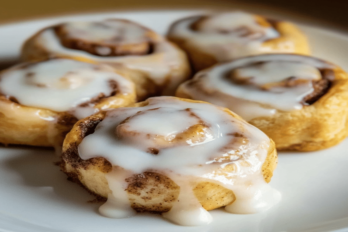 rulouri cu scorțișoară la air fryer aranjate pe farfurie cu glazură lucioasă